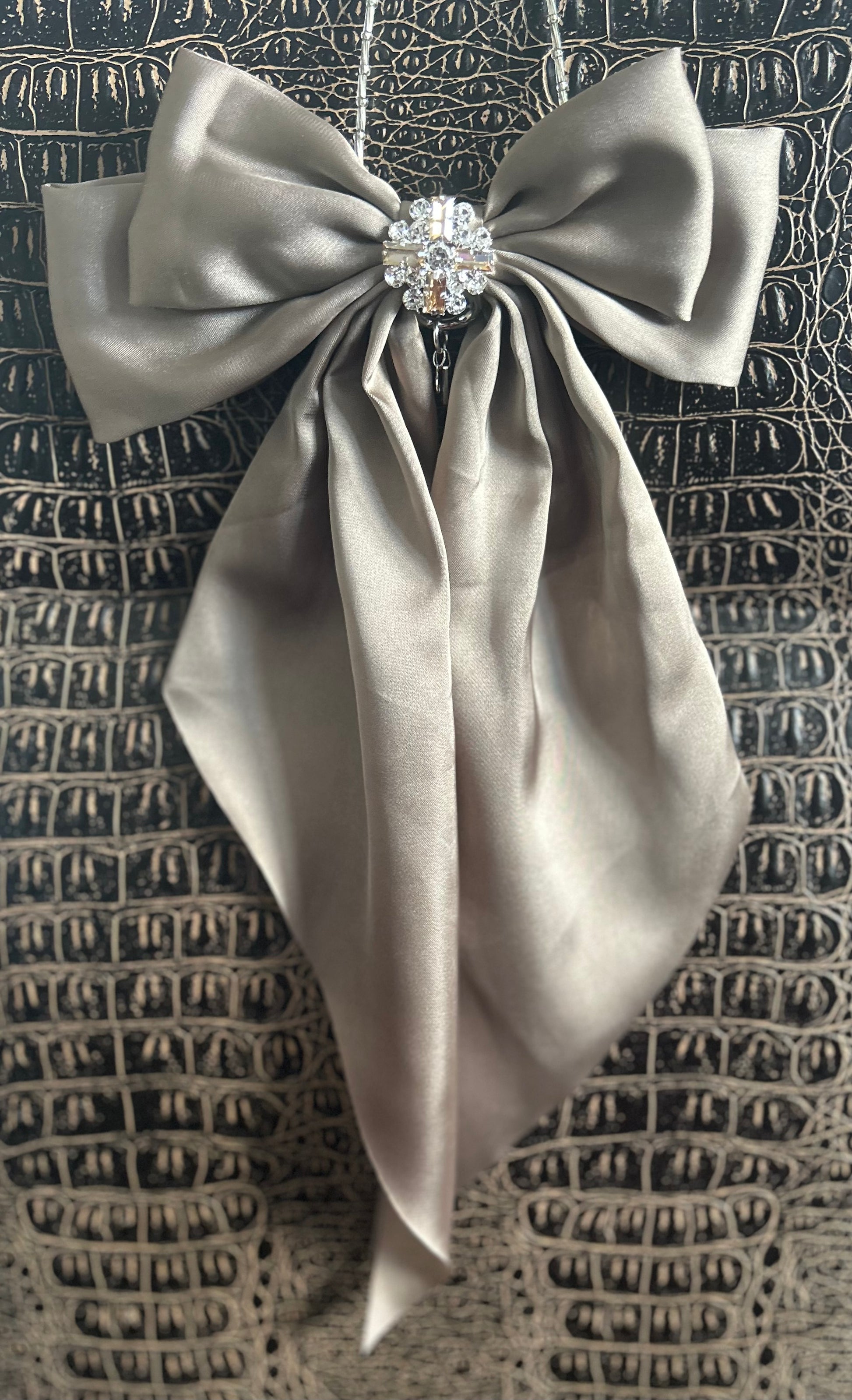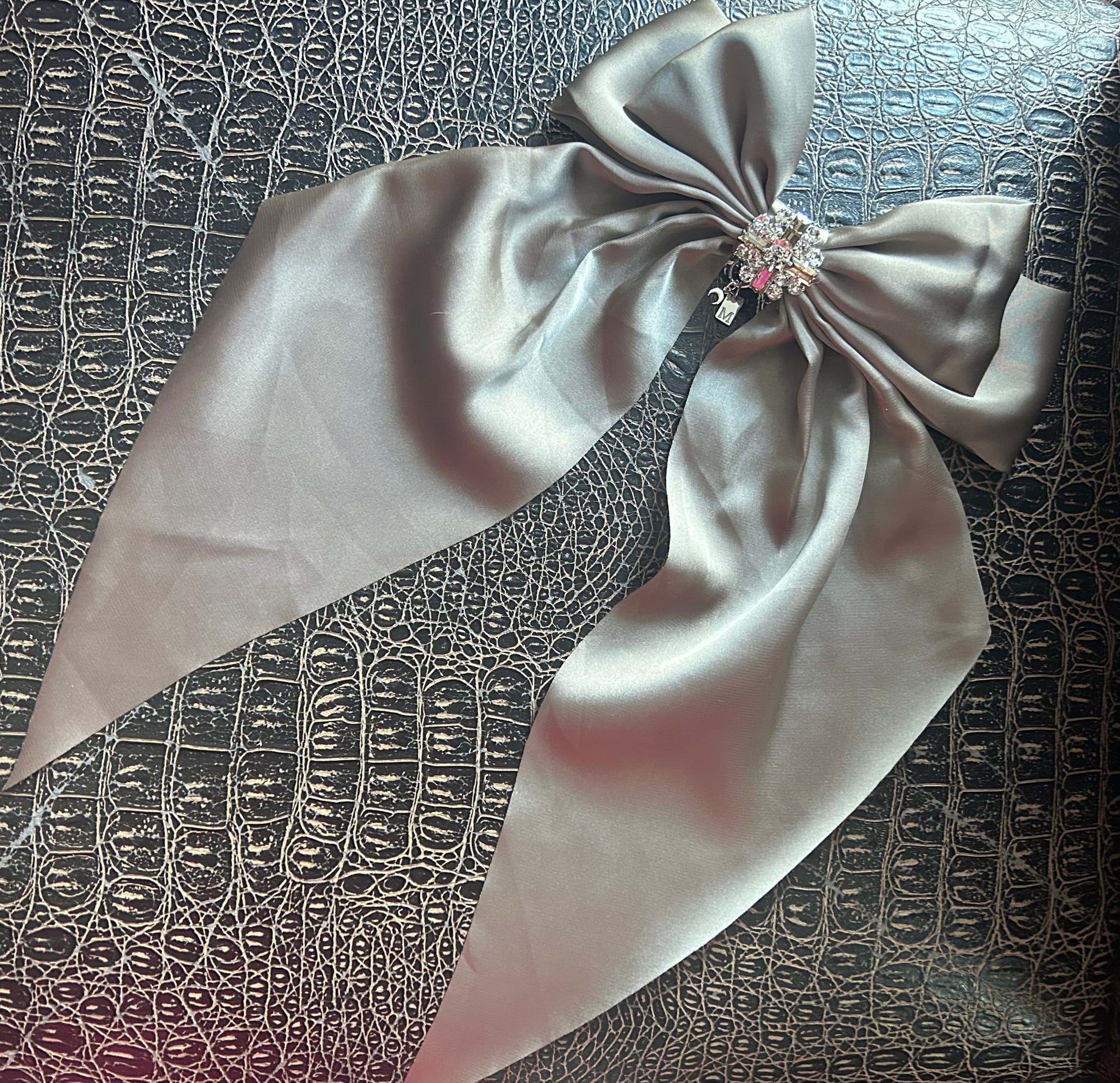 This striking hair bow boasts an elegant design, featuring a dazzling jewel and iconic logo chain for a truly luxurious touch.
